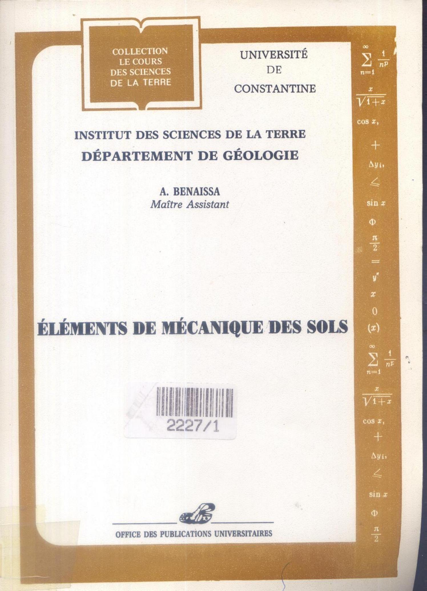 Benaïssa, A. (1992). Eléments de mécanique des sols . OPU;