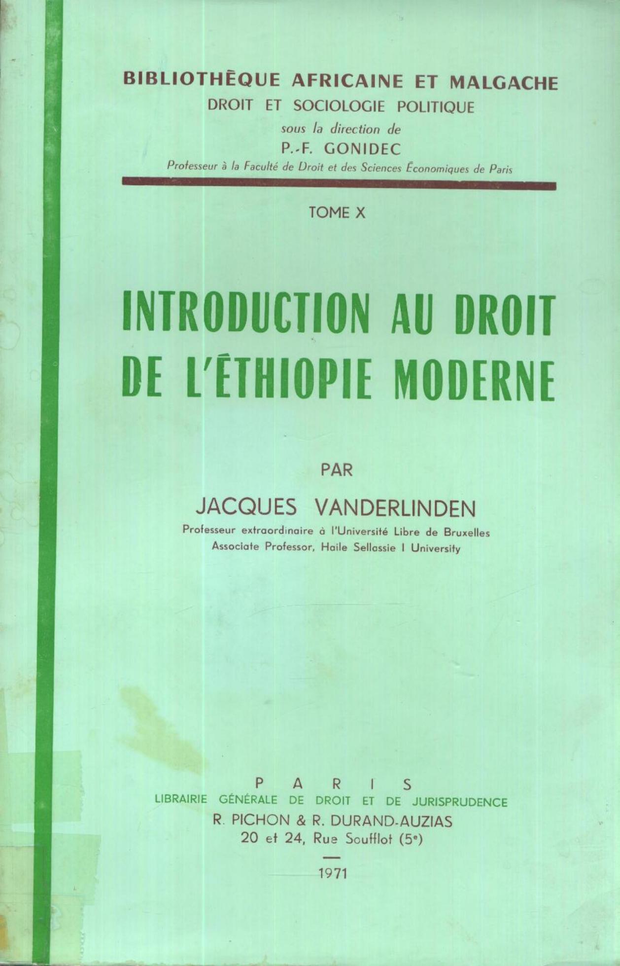 Vanderlinden, J. (1971). Introduction au droit de l'Ethiopie moderne . Librairie générale de droit et de jurisprudence;