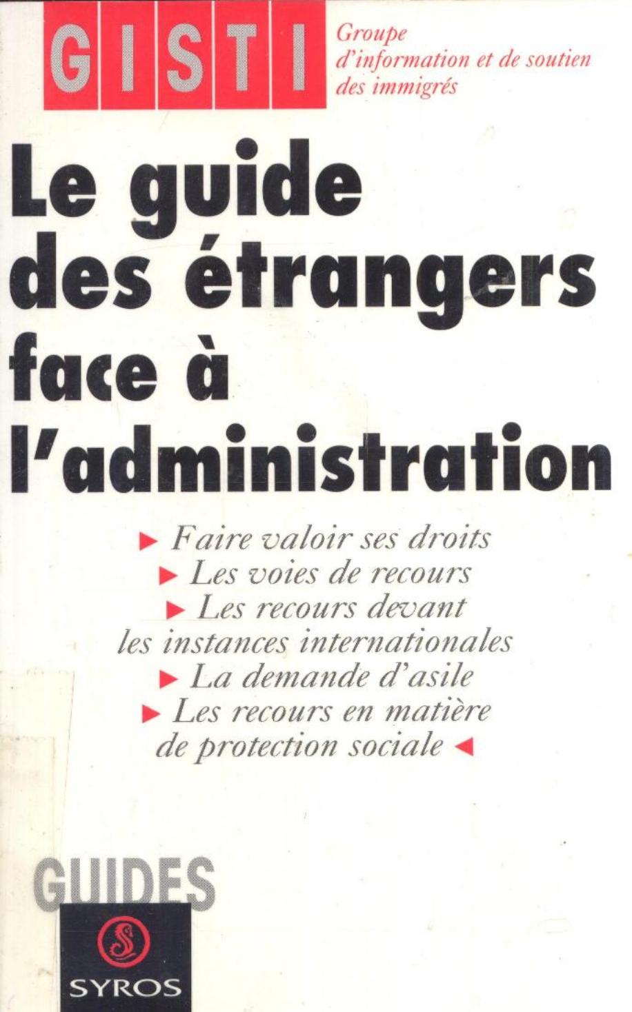 Groupe d'information et de soutien des immigrés (1997). Le guide des étrangers face à l'administration . Syros;