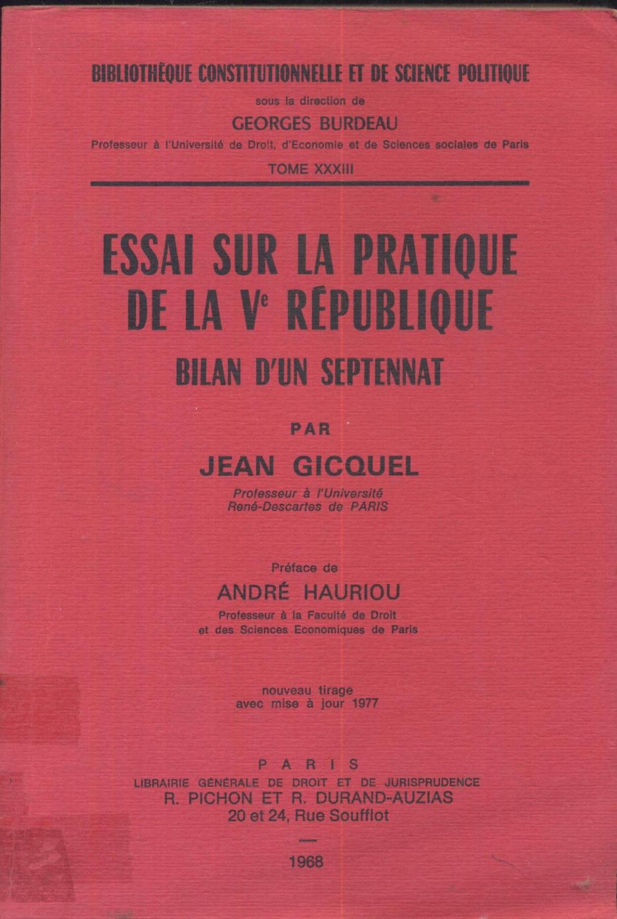 Gicquel, J. & Hauriou, A. (1968). Essai sur la pratique de la Vème république.33, Bilan d'un septennat . L.G.D.J.;