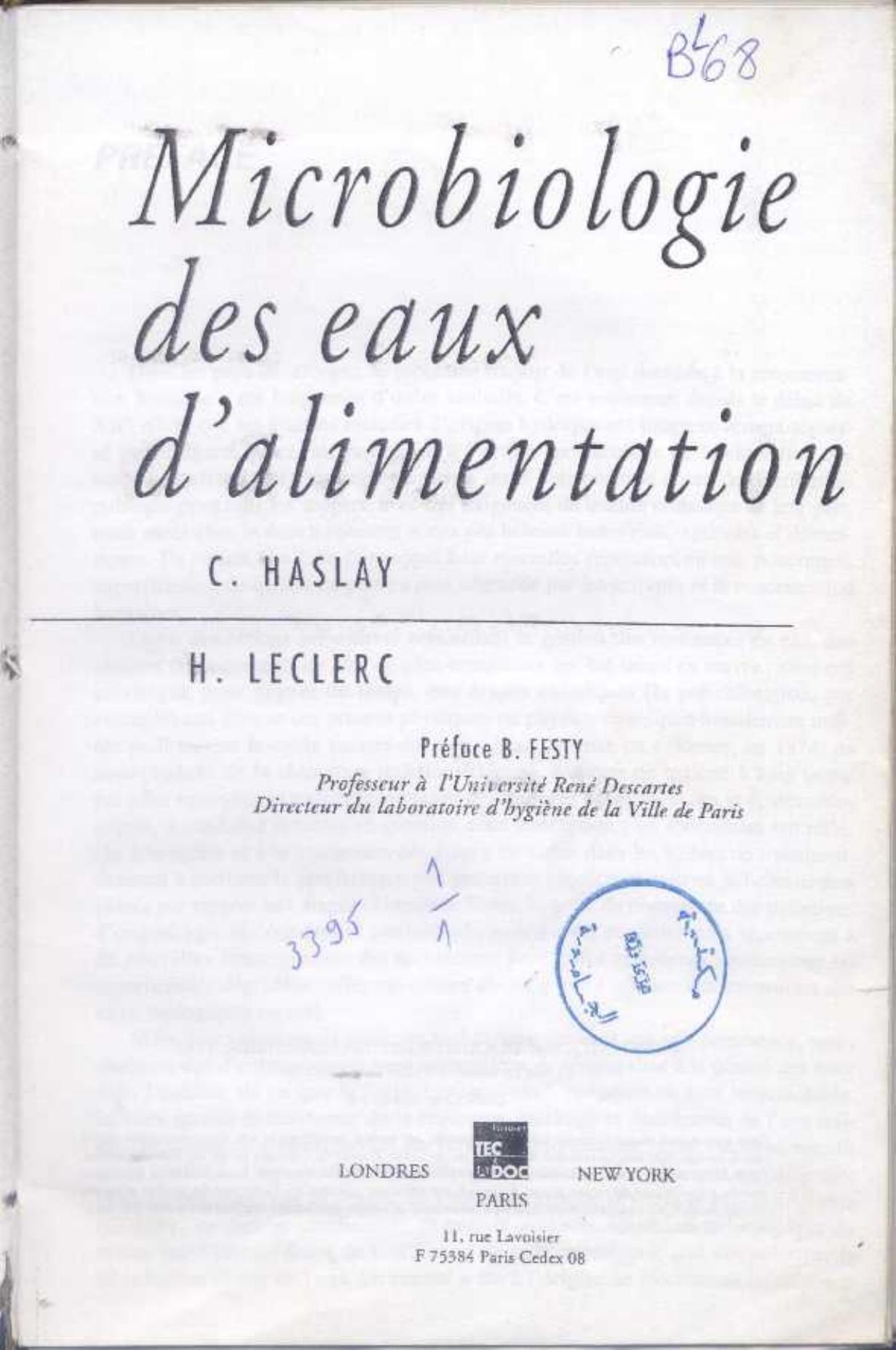 Haslay, C. & Leclerc, H. (1993). Microbiologie des eaux d'alimentation . Technique Documentation;