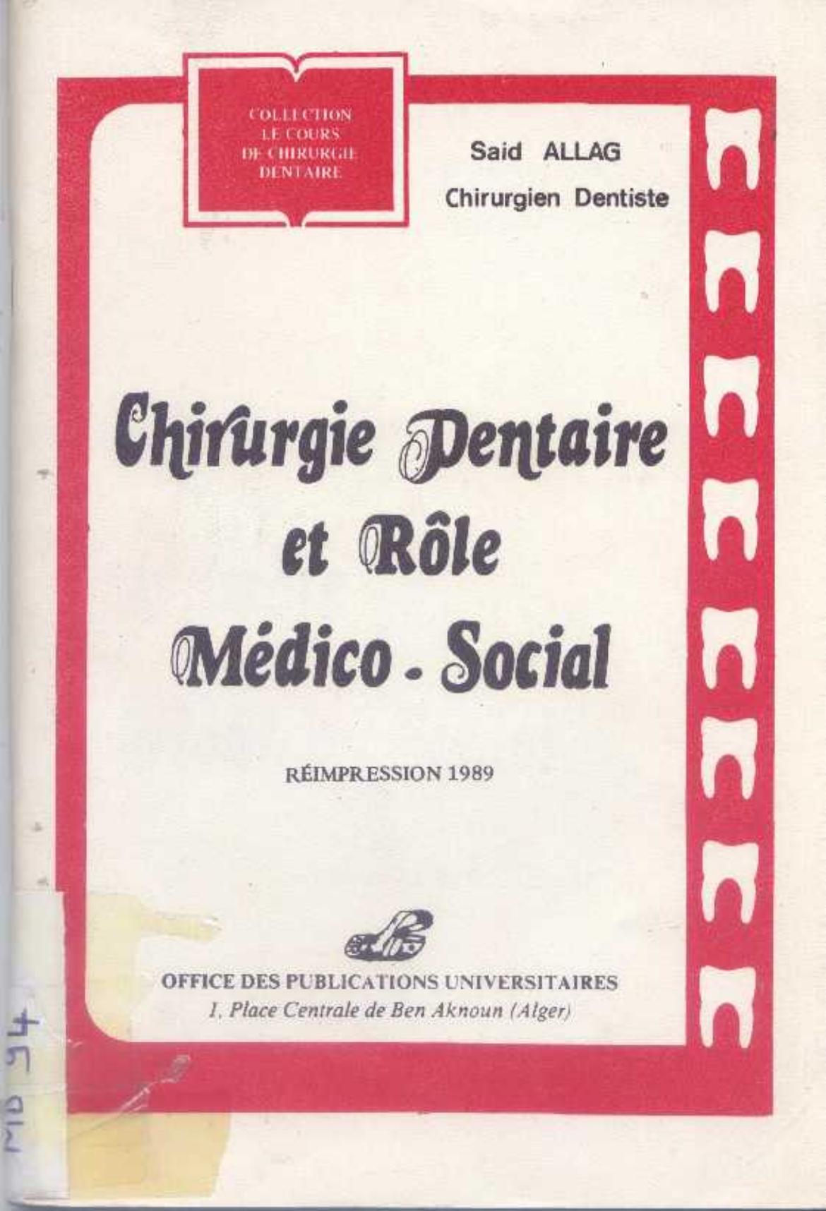 Allag, S. (1989). Chirurgie dentaire et rôle médico-social . OPU;
