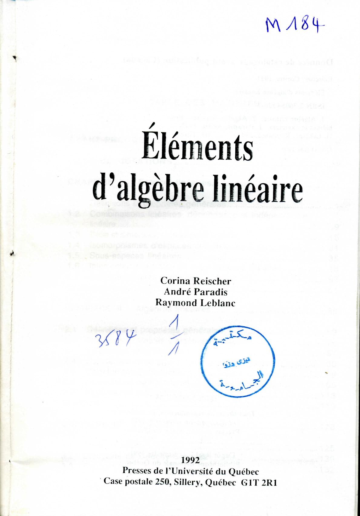 Reischer, C. et al. (1992). Eléments d'algèbre linéaire . Presses de l'université du Québec;
