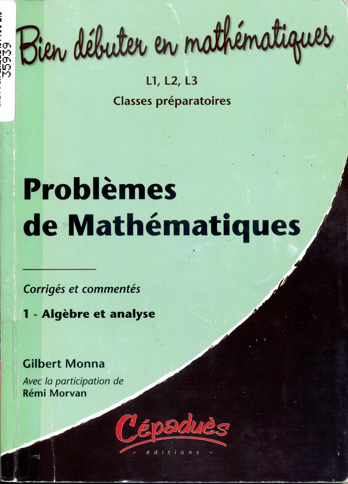 Monna, G. & Morvan, R. (2007). Problèmes de mathématiques : corrigés et commentés. 1, Algèbre et analyse : L1, L2, L3, classes préparatoires . Cépaduès;