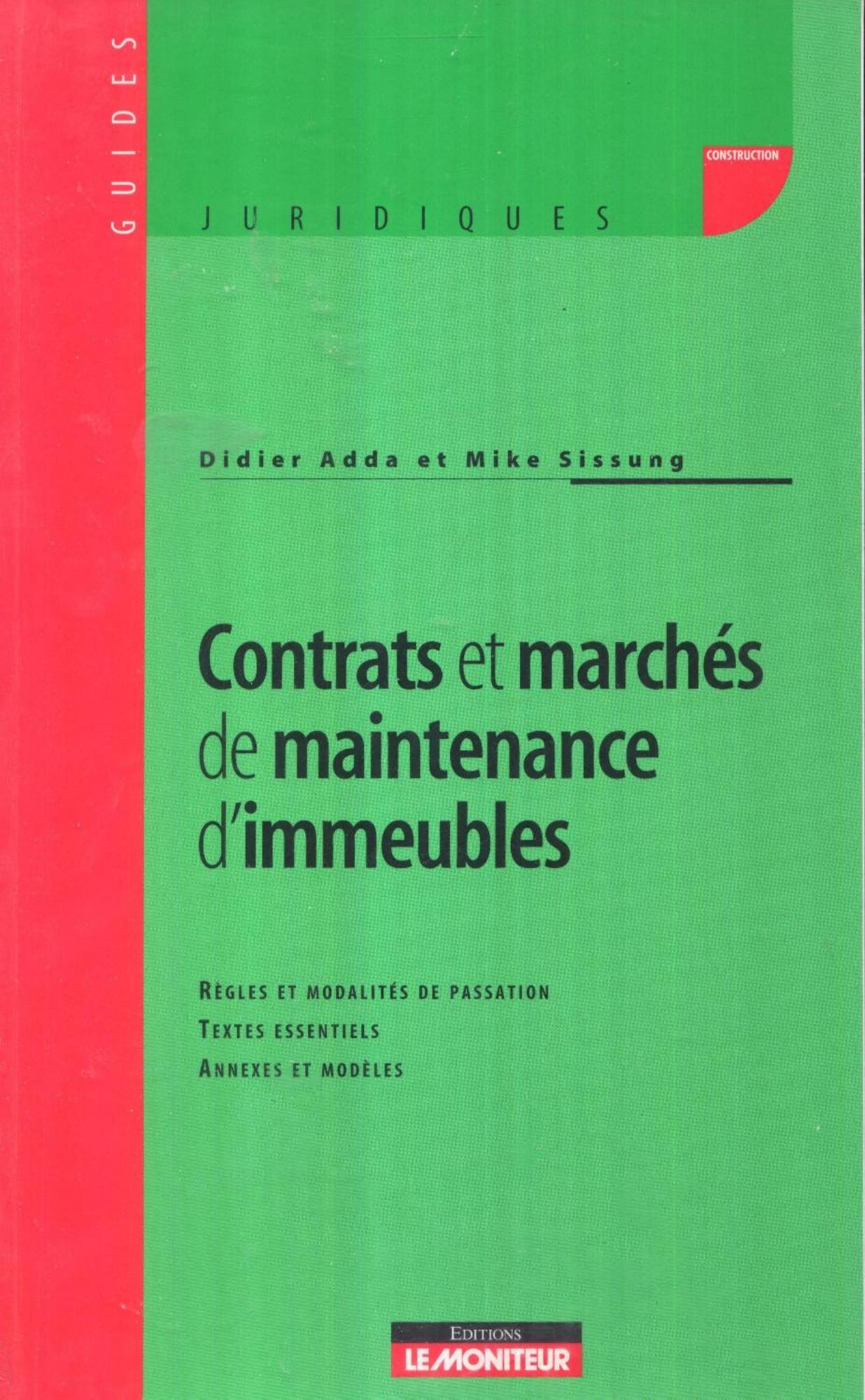 Adda, D. et al. (2007). Contrats et marchés de maintenance d'immeubles : règles et modalités de passation, textes essentiels, annexes et modèles . Le Moniteur;