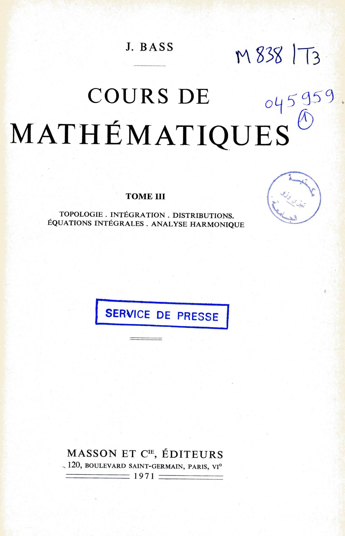 Bass, J. (1964). Cours de mathématiques. 1, Matrices et tenseurs- courbes et surfaces- intégrales simples et multiples- séries et intégrales de Fourier- ... (3è éd.) . Masson et Cie;