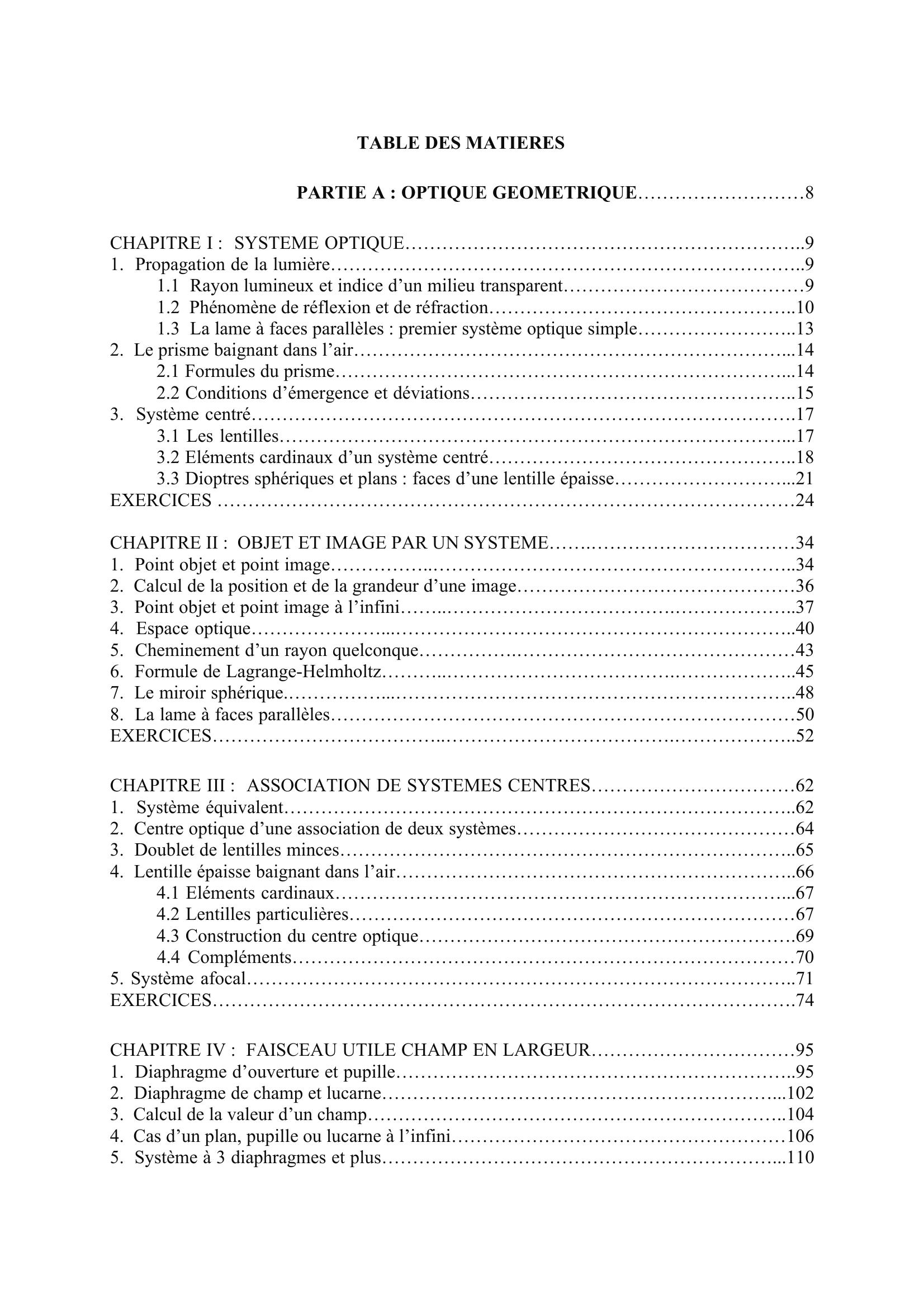 L'ouvrage est principalement destiné aux étudiants en IUT, BTS. Pour les amener à la réussite de leurs examens sur les instruments d'optique traités dans le cadre de l'approximation de Gauss, il propose successivement : o un rappel des bases de l'optique géométrique et la construction des tracés des rayons et faisceaux lumineux dans les instruments ; o une étude des instruments objectifs et subjectifs ainsi que de l'oeil théorique ; o une étude en 3D des systèmes asymétriques de révolution, comme les jumelles à prismes ou les systèmes astigmates. L'exposé est systématiquement complété par des exercices corrigés choisis dans les différents cas pouvant être rencontrés. Cours et exercices sont caractérisés par une quantité importante d'explications sur les constructions graphiques. Le lien est toujours fait entre les calculs et les figures qui les illustrent. Les tracés des rayons et des faisceaux utiles et le raisonnement associé sont présentés à chaque étape de la construction. Les domaines de validité des formules sont largement commentés. Le livre s'attache particulièrement à la caractérisation de la puissance, du grossissement, des champs en largeur et de la résolution des instruments d'optique.