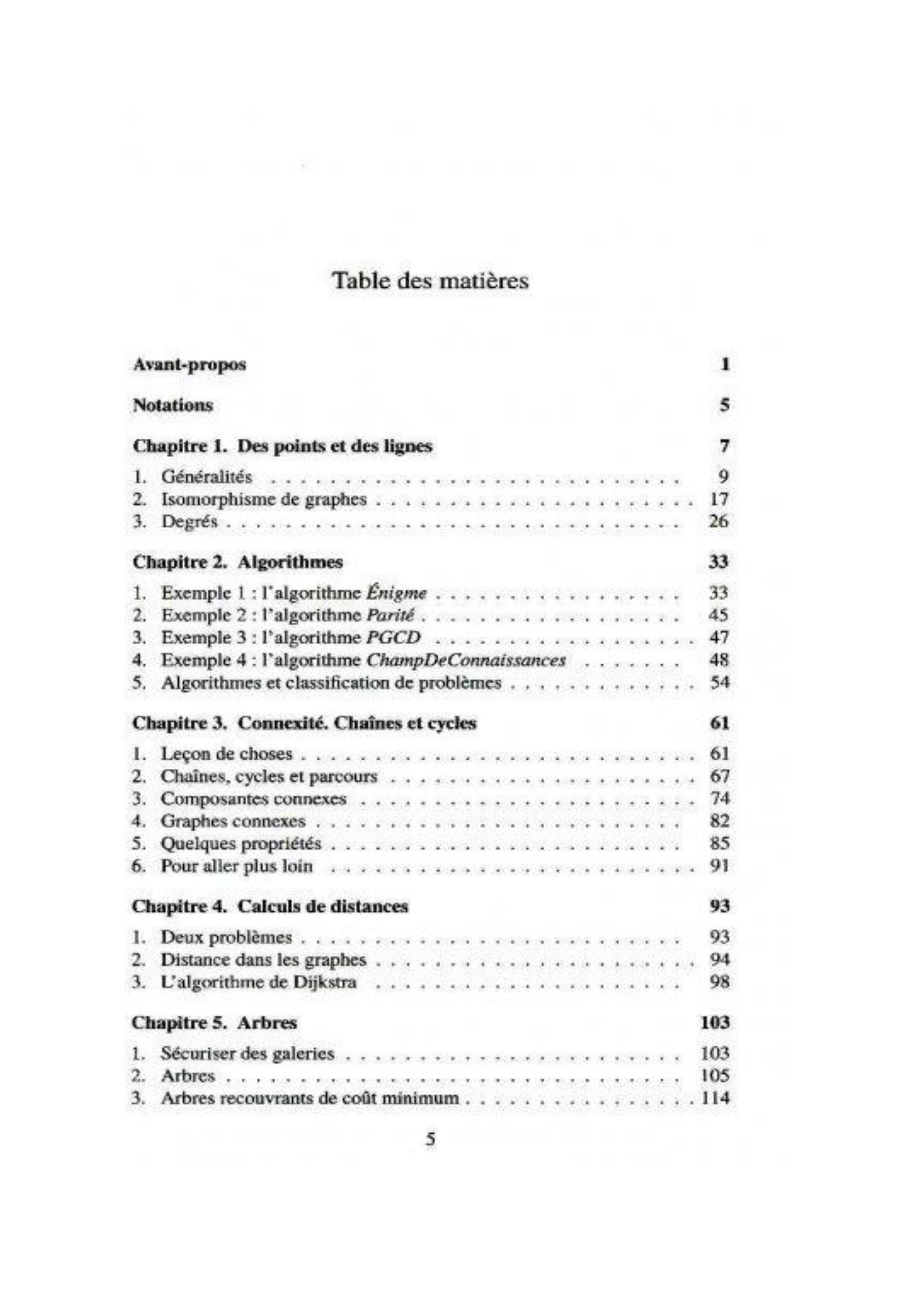 a théorie des graphes est issue de problèmes ayant l'allure de jeux mathématiques, comme le problème du "voyageur de commerce" : tracer le plus court chemin que pourrait emprunter un représentant pour rendre visite à ses clients dans une série de villes, en ne passant qu'une seule fois dans chaque ville. Elle a d'abord trouvé des applications en théorie des probabilités. Ses applications actuelles sont orientées vers la logistique et l'informatique (optimisation des réseaux de transport, de personnes, de marchandises ou de données, optimisation des itinéraires, du stockage, Internet, GPS, architecture des ordinateurs) et elle suscite de ce fait un intérêt grandissant. En retour, on utilise abondamment l'informatique pour donner des solutions pratiques aux problèmes de graphes que l'on se pose, d'où l'importance donnée dans ce livre aux algorithmes. La théorie des graphes a été introduite il y a une quinzaine d'années dans les programmes du secondaire français, et ce livre a été écrit à cette occasion, à l'intention des professeurs. Un graphe se définit simplement comme un ensemble de points dont certains sont reliés par des lignes. Le premier problème considéré comme un problème de théorie des graphes est celui des sept ponts de K?nigsberg (Euler, 1736), qu'on peut aisément transposer à Paris : peut-on effectuer une promenade qui nous ramène à notre point de départ en empruntant une fois et une seule chacun des ponts de la ville ? La formulation de ce problème comme un problème de graphes fait intervenir quatre points, A, B, C, D représentant respectivement la rive droite, la rive gauche, l'île de la Cité et l'île Saint-Louis, et des lignes reliant ces points, représentant les ponts. Le célèbre problème des quatre couleurs (peut-on colorier n'importe quelle carte avec quatre couleurs seulement, de façon que deux pays voisins n'aient pas la même couleur ?) peut aussi se traduire un termes de graphes : un point par pays, une ligne reliant deux points si les deux pays ont une frontière commune. Et il est de même du célèbre problème du loup, de la chèvre et du chou. On conçoit qu'un grand nombre de problèmes de la vie économique puissent être traités et résolus comme des problèmes de graphes : pour une compagnie aérienne, comment éviter qu'à un certain moment tous les avions se trouvent d'un côté de l'Atlantique et presque tous les pilotes de l'autre côté ? Vu le grand nombre de données en jeu, la résolution pratique de ce genre de problème implique l'usage des ordinateurs. L'informatique, avec ses réseaux, avec l'architecture des ordinateurs, est elle-même la plus grande consommatrice de théorie des graphes. On peut être surpris que des objets aussi pauvres que les graphes puissent donner lieu à une théorie aussi riche. La réponse est certainement dans la variété des problèmes posés par les applications. Le livre de Cogis et Schwartz, qui n'oublie pas l'anecdote et les applications, présente la théorie de graphes comme une théorie mathématique, avec des définitions et des énoncés précis, et des démonstrations complètes ce qui est nécessaire pour permettre à l'étudiant de comprendre et d'élaborer lui-même les algorithmes de résolution des problèmes qui forment une partie essentielle du livre.