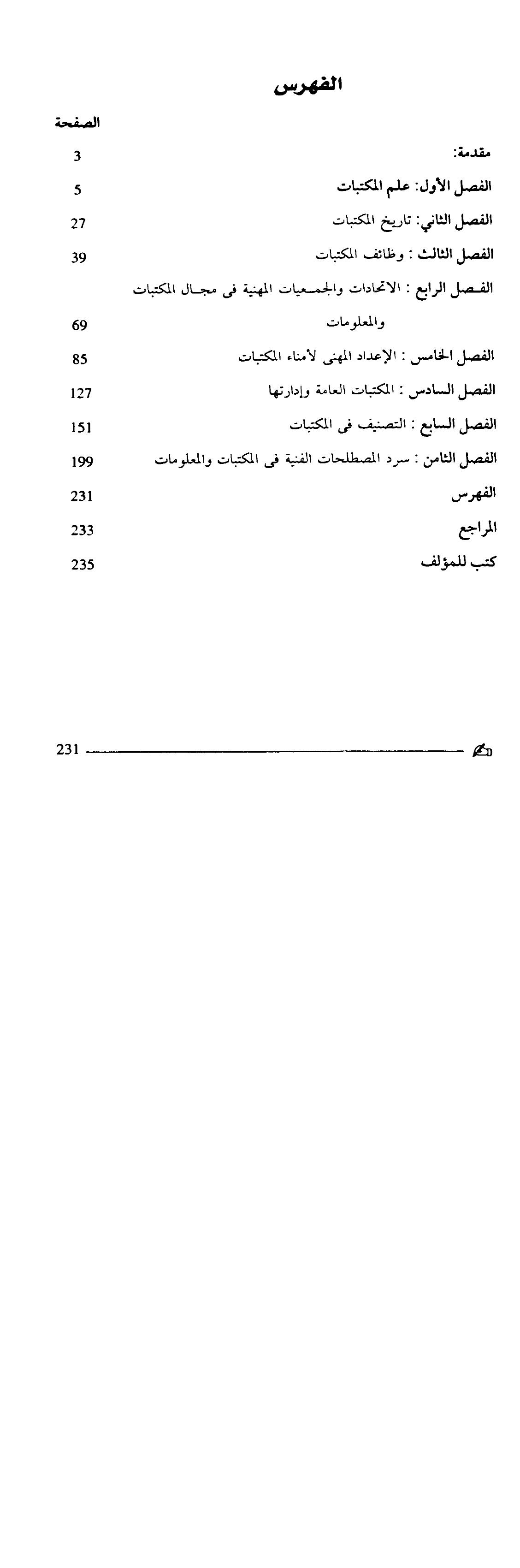 يتناول هذا الكتاب علم المكتبات وتاريخ المكتبات، وظائف المكتبات والاتحادات والجمعيات المهنية في مجال المكتبات والمعلومات. وتطرق إلى الإعداد المهني لأمناء المكتبات والمكتبات العامة وإدارتها. كما تناول التصنيف في المكتبات وسرد المصطلحات الفنية في المكتبات والمعلومات