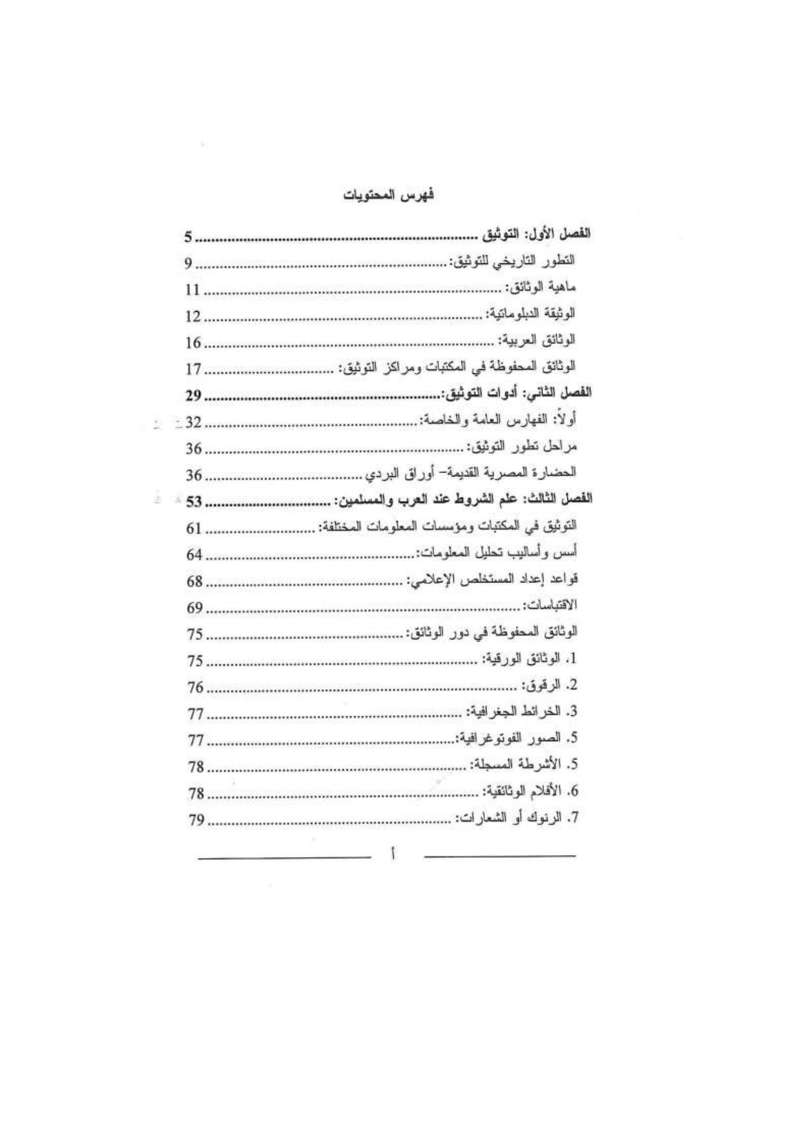 يضم هذا الكتاب ثلاثة عشر فصلا : الفصل الأول: "التوثيق"، "أدوات التوثيق"، "علم الشروط عن العرب والمسلمين"، "الوثائق العربية عبر العصور التاريخية"، "الوثائق القومية وأنواعها"، "إدارة الوثائق"، "الإجراءات الفنية لتنظيم الوثائق"، "حفظ الوثائق وتداولها"، "الأرشيف"، "الأرشفة الإلكترونية"، "المباني والأجهزة والمعدات"، "دور الوثائق"، "المنظمات الدولية للوثائق".